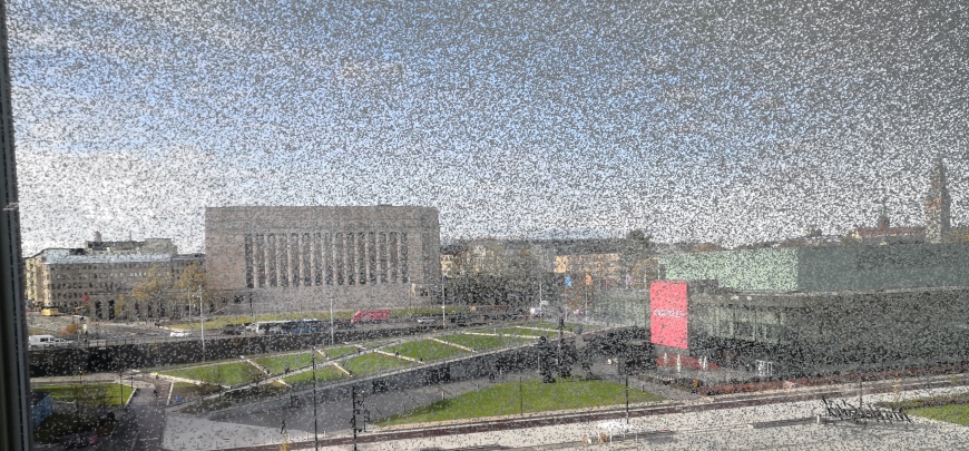 Kuva otettu 15.10.2019 Helsingin keskustakirjasto Oodin kolmannesta kerroksesta rakeisen "lumihiutalelasin" läpi. Kuva: KivaaTekemistä.fi